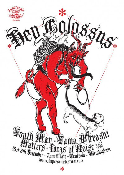 Teenagers. A persistent worry aren’t they? Hanging about down by the canal, chucking shopping trolleys into the oily murk and so on. Tonight’s headliners Hey Colossus are now fifteen and their hosts, the good people of Supersonic, have just made the first announcements for next year’s fifteenth festival. In celebration, and with a nod to the season, they’re putting on this Christmas-ish affair whose flyers feature Krampus capturing a defenceless sausage dog. Probably going to drown it in the canal to scare them kids ‘cos he’s a proper wrong ‘un that Krampus.