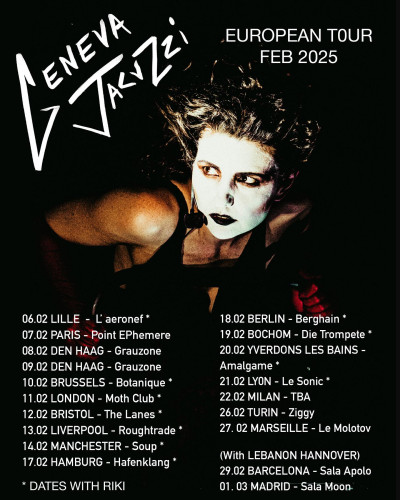 Last up is Geneva Jacuzzi, and finally the mysterious black-and-white set pieces onstage are contextualized. Two backing dancers, and Geneva, at first with a cone obscuring her head and tubing covering her arms, appear, wearing similarly monochromatic full-body spandex. All that I wrote about Riki’s creative self-realization can be applied to Geneva Jacuzzi also – it’s a perfectly matched bill-share. Behind her is a projected screen that for each song might display lyrics word-by-word, images of A-list celebrity women or more hypnotic spirals. Geneva and her dance partners strike poses and hold props. In one instance she considers a white ball like Hamlet with a skull before spinning with it in orbit. It feels like we’re witnessing, or even partaking in, an avant-garde tongue-in-cheek ritual. I’m sure Geneva is summoning the spirit of art itself; I’ve never been instilled with such creative inspiration during a gig. Her assured synth-pop, incantation-like vocals, expressive physicality and visuals are at once in her complete control and exuding independently out of her, self-referential and free. During one song she splits the audience in two and performs in the parting, ensuring the celebration makes it all the way to the back of the venue. More than anything else, the set is utterly joyful.