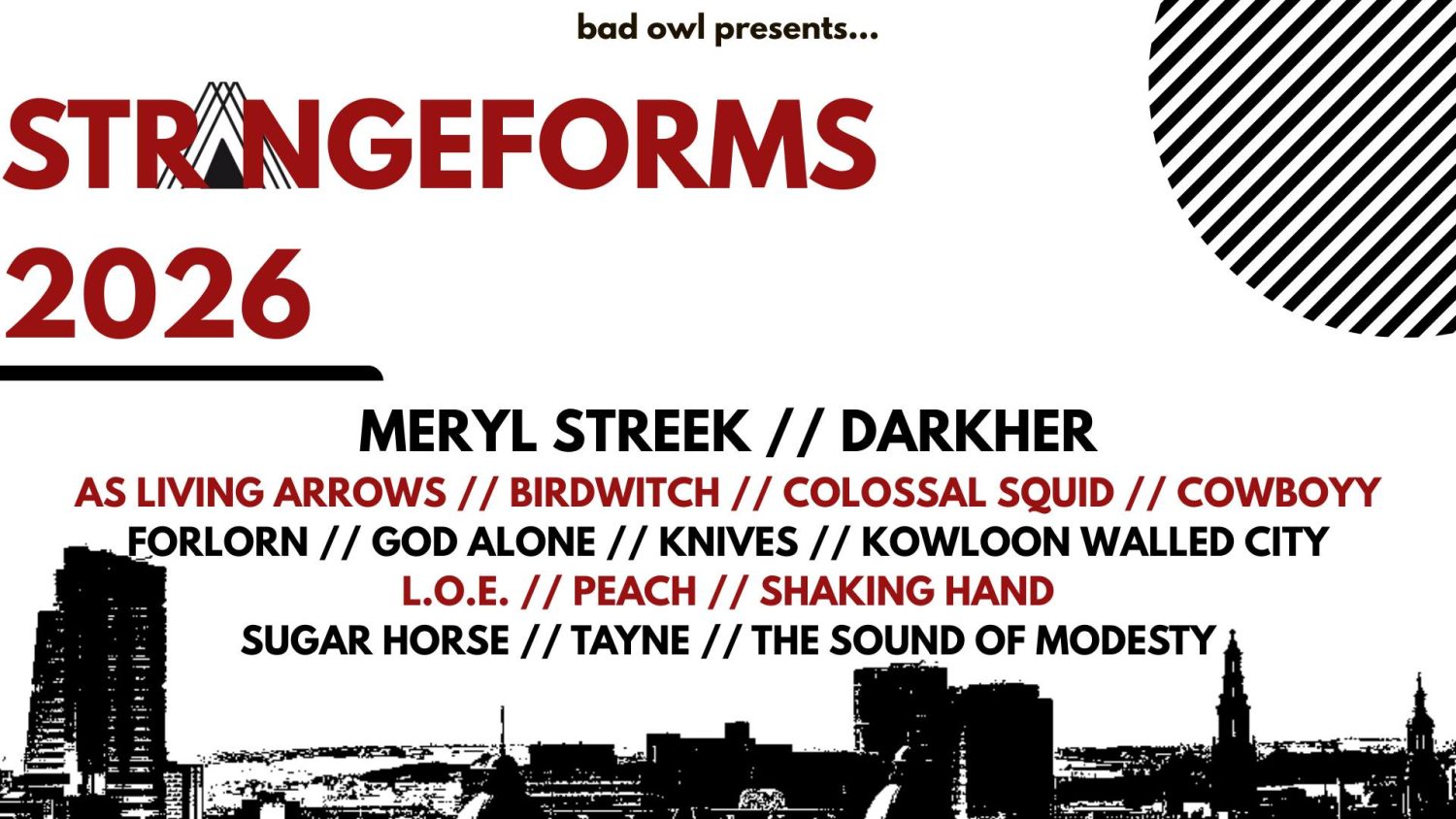 For those unfortunates who have never been to, or just don’t know about, the StrangeForms Festival, it’s a yearly two-day feast of post-rock, post-metal, math-rock, shoegaze and other assorted alternative/underground rock music. In Leeds. Originally in WHARF CHAMBERS, but now firmly established in the BRUDENELL SOCIAL CLUB. Alumni of the fest include MAYBESHEWILL, NORDIC GIANTS, AND SO I WATCH YOU FROM AFAR, SVALBARD, CONJURER and the like. It’s always sometime close to the Easter weekend, as, indeed, it is this year, being on the 18th and 19th of April. It never rains for StrangeForms1.